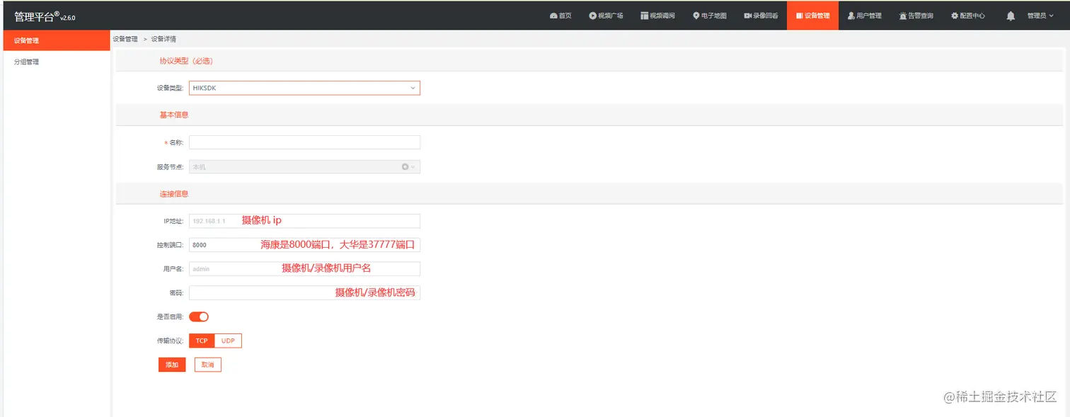 依次填写相关信息,包括摄像机IP、端口、摄像机的用户名和密码等:
