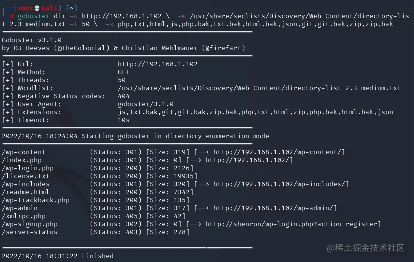 gobuster dir -u http://192.168.1.102 \ -w /usr/share/seclists/Discovery/Web-Content/directory-list-2.3-medium.txt -t 50 \ -x php,txt,html,js,php.bak,txt.bak,html.bak,json,git,git.bak,zip,zip.bak