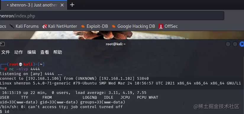 6.把index.php源码改成php-reverse-shell.php(github里有),保存后,开启监听,访问页面,成功反弹shell