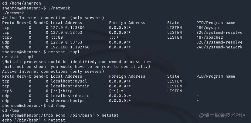 4.我们新建一个netstat文件写入提权命令,让它替换network