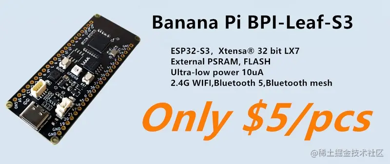 BPI-Leaf-S3采用乐鑫ESP32-S3芯片设计,采用Xtensa®32位LX7双核处理器,主频最高可达240 MHz。支持2.4 GHz Wi-Fi和蓝牙®LE双模无线通信,外设兼容低功耗硬件设计,深度睡眠模式下功耗仅为10uA。主控制器支持USB和外接3.7V锂电池两种供电方式,可实现自动电源开关功能。