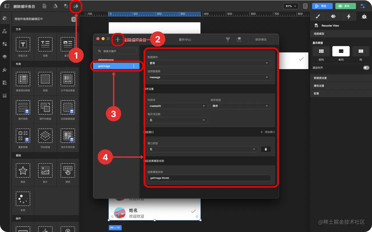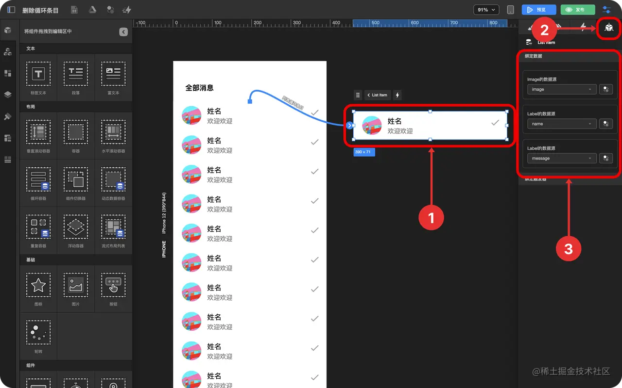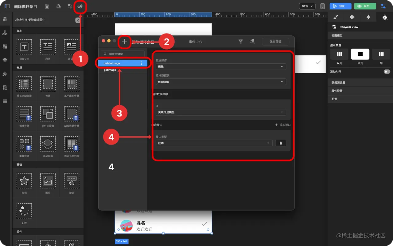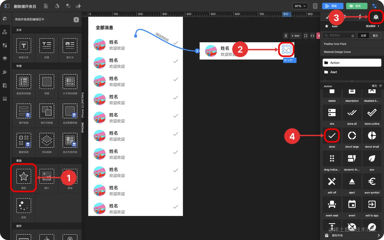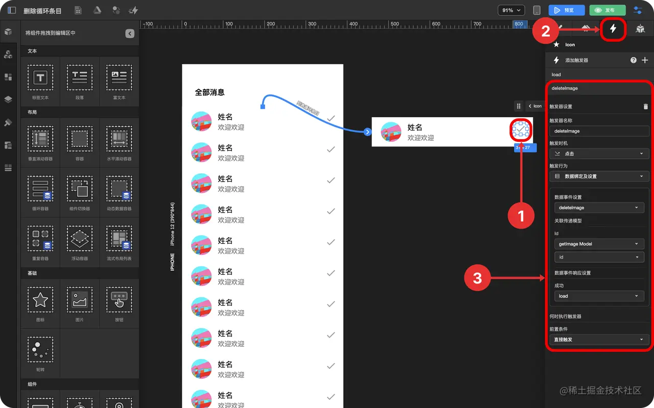 如何删除数据并刷新列表 TOWIFY 2022-10-17 283 阅读1分钟 在循环容器中使用数据中心和触发器实现删除某一条数据 效果展示 前置准备 一个消息列表 一个消息数据表 具体步骤(3) 添加一个图标 创建消息查询与删除事件 创建消息查询与删除触发器 步骤分解 添加一个图标 拖拽 图标组件 到 循环容器条目 中 选中图标 点击 检查面板 中的 数据绑定与设置 选择图标 创建消息查询与删除事件 点击 事件中心 点击加号 选中图标 创建触发器 - 选中 循环条目 绑定数据