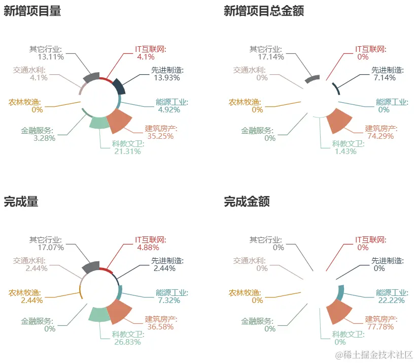 塔米周报按照行业对新增项目量、新增项目总金额、完成项目量、完成项目金额进行了统计并可视化展示。