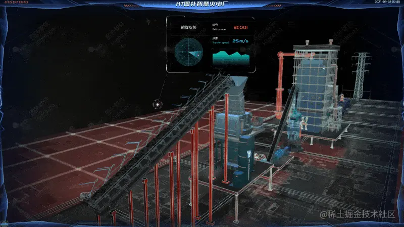 图扑软件可视化平台将火电厂、设备机器、人员等信息集成展现,打造全面感知、全面覆盖、全面可视、全面可控的智慧工厂管理系统。场景内冷色调的黑、灰、蓝、青为主,让人产生不同于传统设计的新奇体验。