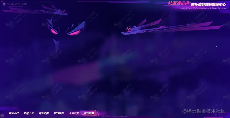 图扑软件 5G 智慧城市可视化系统同样采用赛博朋克风格元素设计。动态光圈效果炫酷且科技感十足,可帮助我们快速聚焦视线,找到项目重点内容。