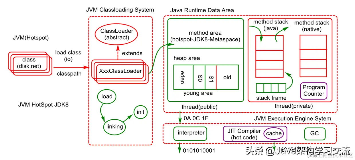 JVM (JAVA 虚拟机),定义了一套编译,加载,解释执行JAVA代码的规范,