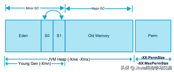 Java堆的内存划分如图所示,分别为年轻代、Old Memory(老年代)、Perm(永久代)。其中在Jdk1.8中,永久代被移除,使用MetaSpace代替。