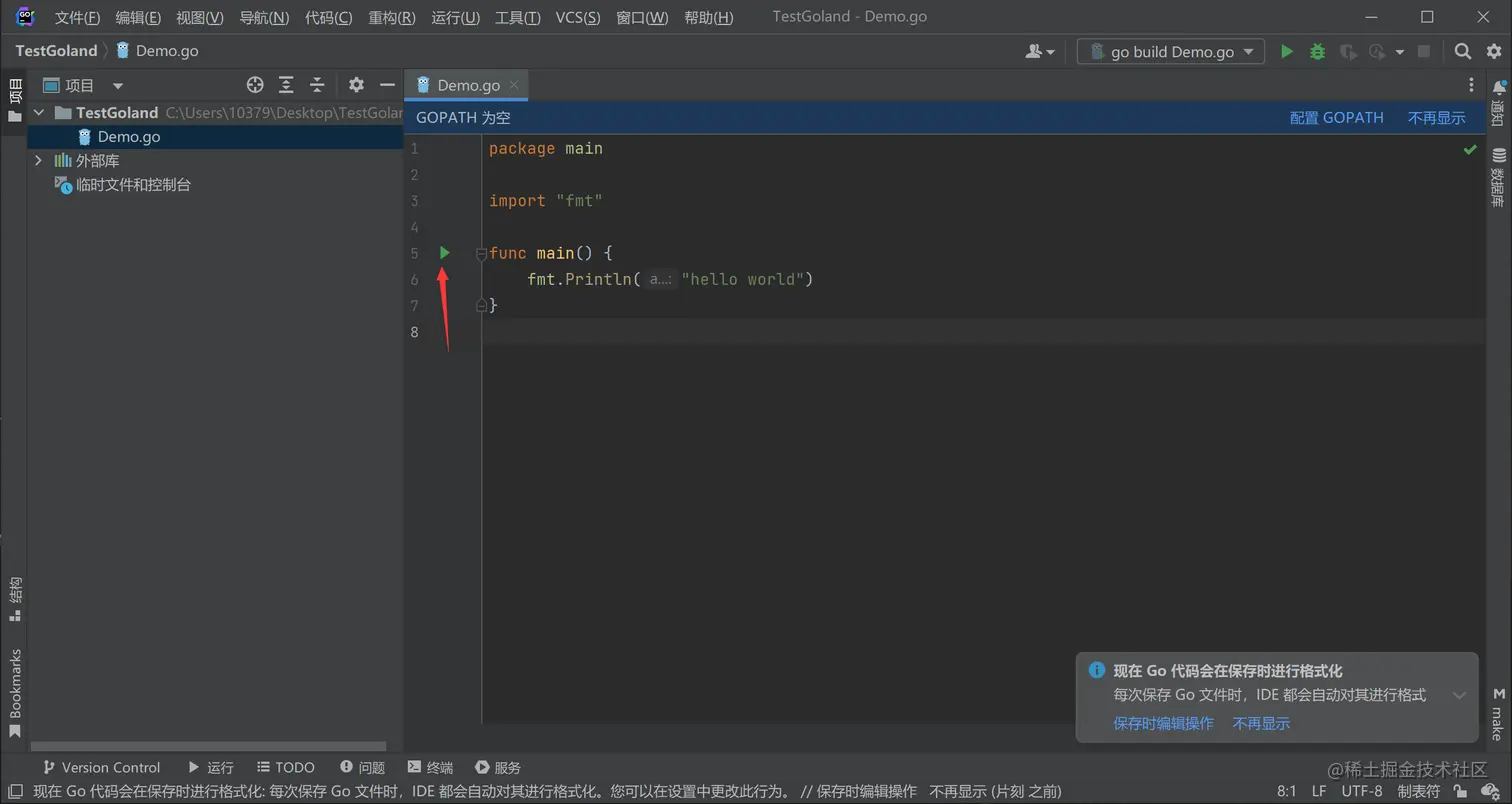 GoLand 选择你电脑上安装好的 GO 编程环境 创建一个 Demo 工程,点击如图所示运行按钮,若能成功执行,则环境搭建完毕!