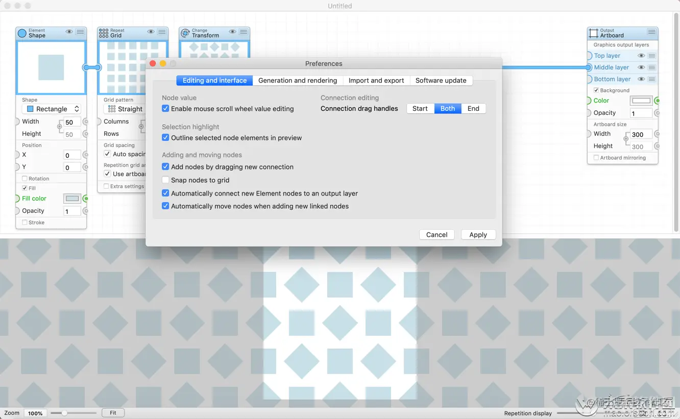 PatterNodes是一款基于重复创建图形模式,动画或插图的程序设计。这是通过定义一系列描述设计的步骤完成的,使用它们之间的节点和连接。PatterNodes的设计从一开始就可以很容易地调整一些东西,看看它们是如何变化的。因此,最终的设计输出将始终显示在底部预览视图中,对于模式重复进行更新并随时进行更新,从而即时反馈最终结果。
