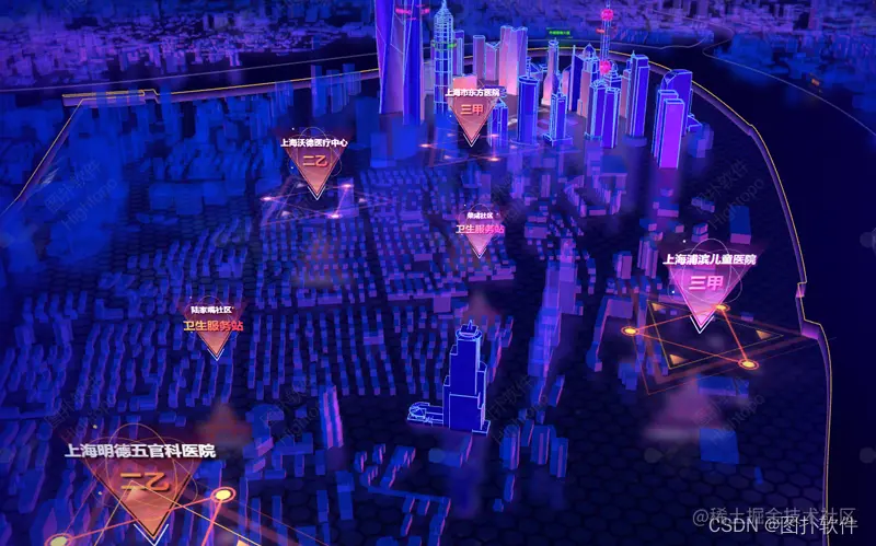 将医院信息接入图扑可视化系统,统计街区内的重点医疗单位,如三甲、二乙、二甲等医院位置并标出精确到详细门牌号的地址,同步到便民 APP 便于市民查看就医,同步完善区域卫生规划和医疗机构设置,建设智慧医院。加强对医疗保障基础信息数据、结算数据、定点医药机构管理数据的采集、存储、清洗、使用,完善部门数据协同共享机制,探索多维度数据校验,提升精细化治理水平。