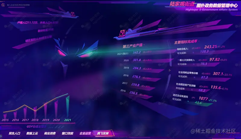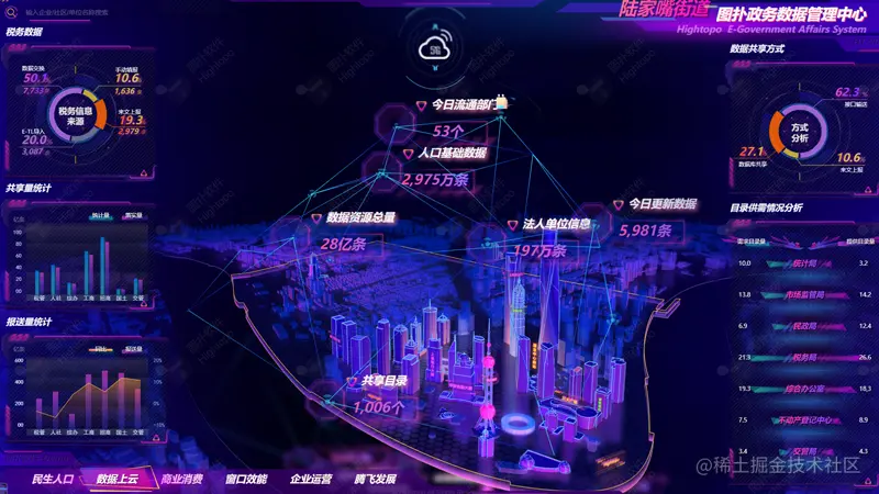 以陆家嘴街道政务为例,运用图扑数字孪生技术呈现赛博朋克风格的智慧街道政务系统,实现民生人口、商业消费、窗口效能、企业运营数据的“一网统管”,打造一体化一盘棋数字政府建设体系,推动在营商环境、生态文明、城市运营、民生保障、行政效能、公共支撑等领域的智慧管理。