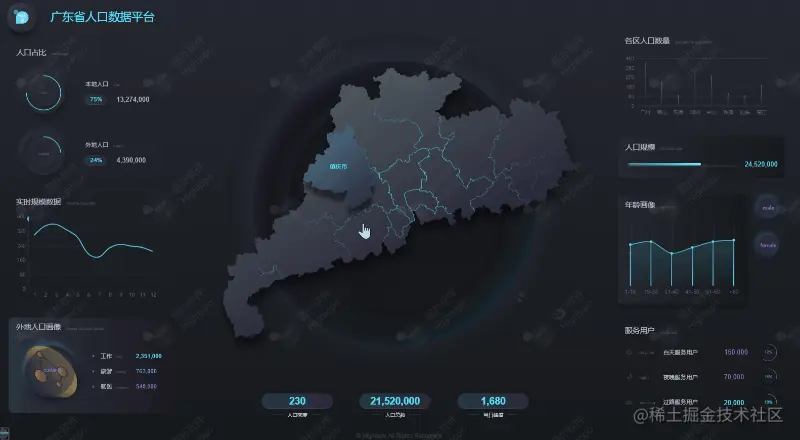 运用图扑软件可视化系统进行人口管理,助力政务管理数字化转型。以广东省人口数据平台为例:将鼠标放至广东省不同市,则该区域高亮显示,人口密度、人口总数、当日峰值的数据随之变化。采用环形图、折线图展示本地人口、外地人口百分比和每月人口规模数据;将外地人口、年龄层次、各区人口数量进行画像,了解广东人口组成的每一个细分层面。以便贯彻计划生育的基本国策,控制城市人口的机械变动,实现对城市人口全面统一的管理。