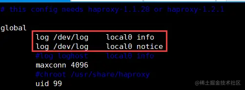 1og /dev/log local0 info #修改这两行,定义haproxy日志输出设备和日志级别
