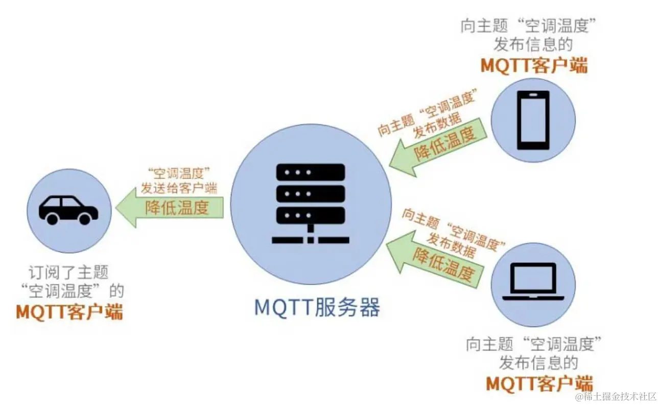 上图中的所有客户端都是围绕“空调温度”这一主题进行通讯的。对于“空调温度”这一主题,手机和电脑客户端成为了MQTT信息的发布者而汽车则成为了MQTT信息的订阅者(接收者)。