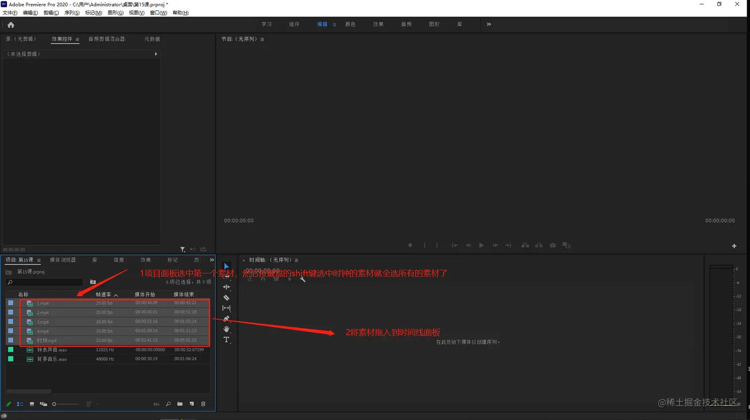- 将项目面板中的视频素材拖入到时间线面板上建立序列