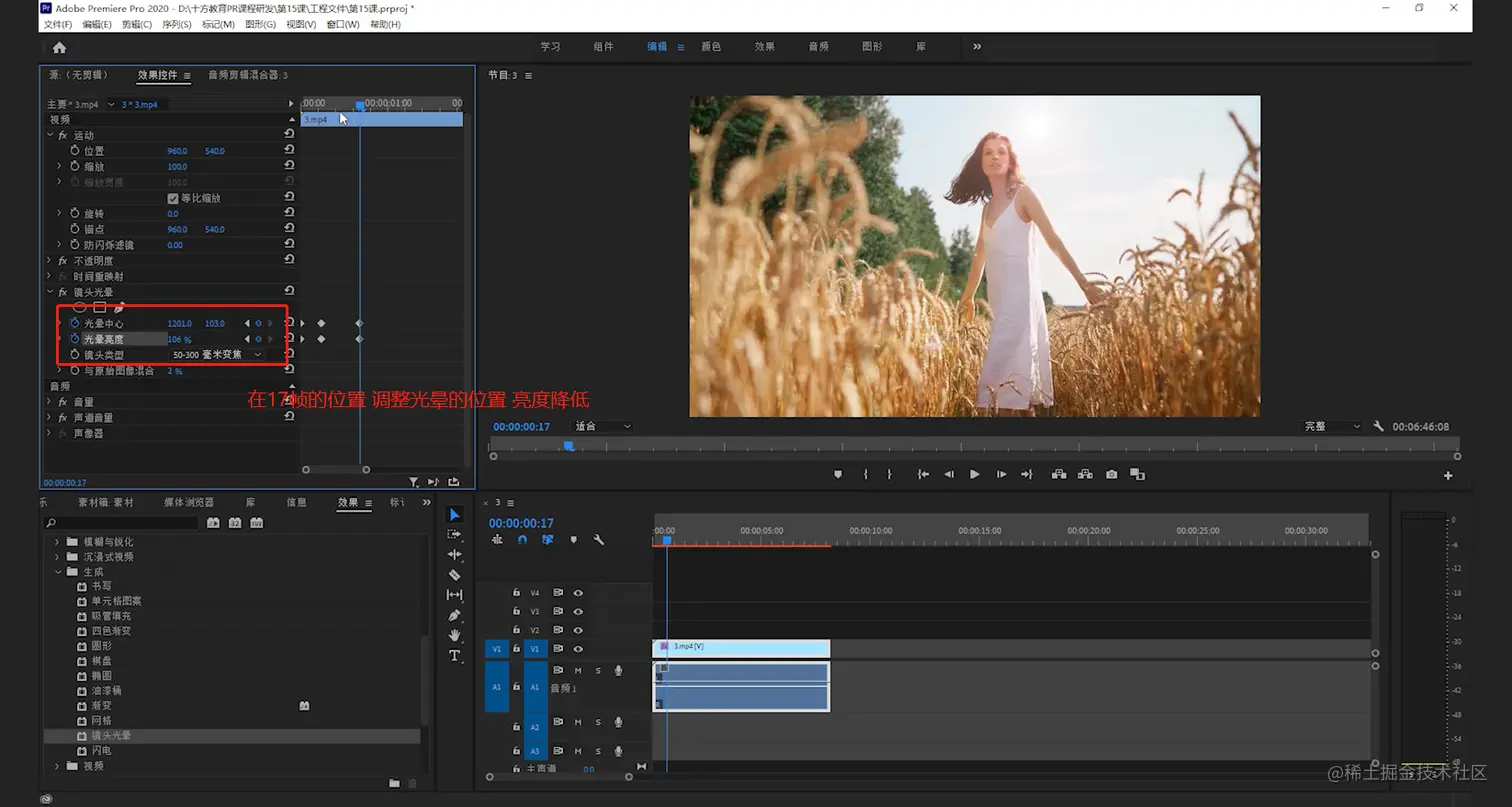 【视频效果】-【生成】-找到【镜头光晕】也可直接搜索镜头光晕,将镜头光晕效果拖给视频