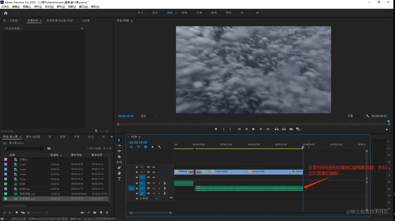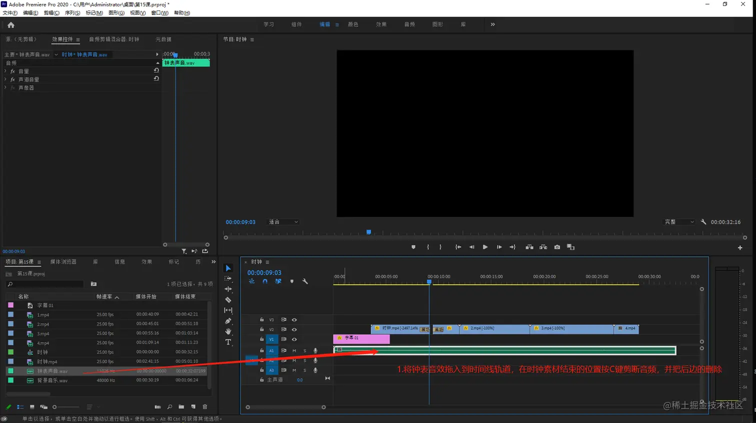 - 将钟表的音效拖入到音频轨道上,然后再时钟素材结束的位置按C键将素材剪断,把后边的删除掉。
