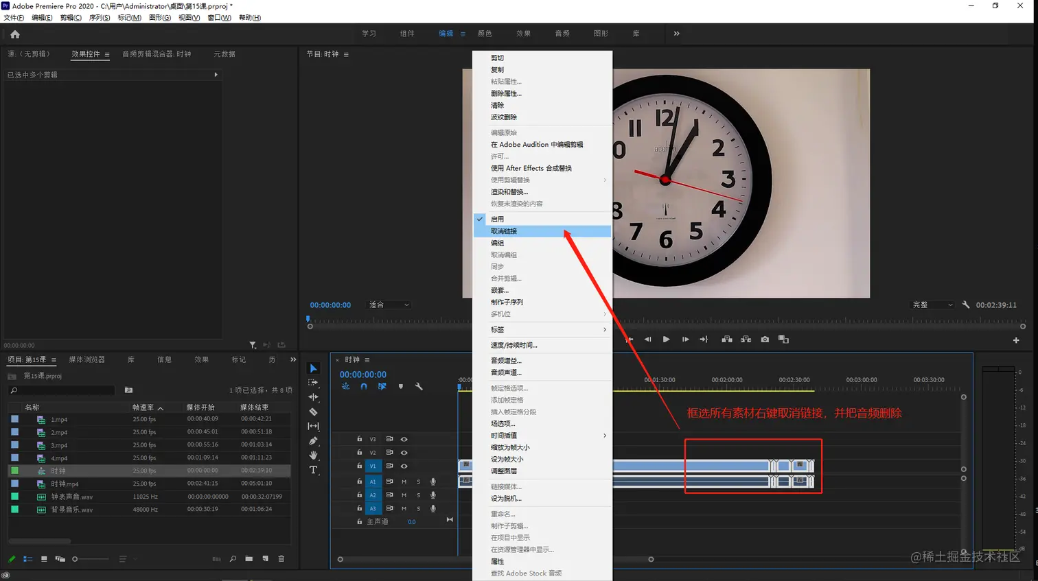 - 框选所有素材右键-取消链接,将音频删除