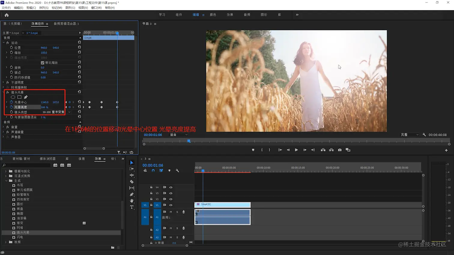 - 在1秒6帧的位置 调整光晕的位置,并把光晕亮度调成166