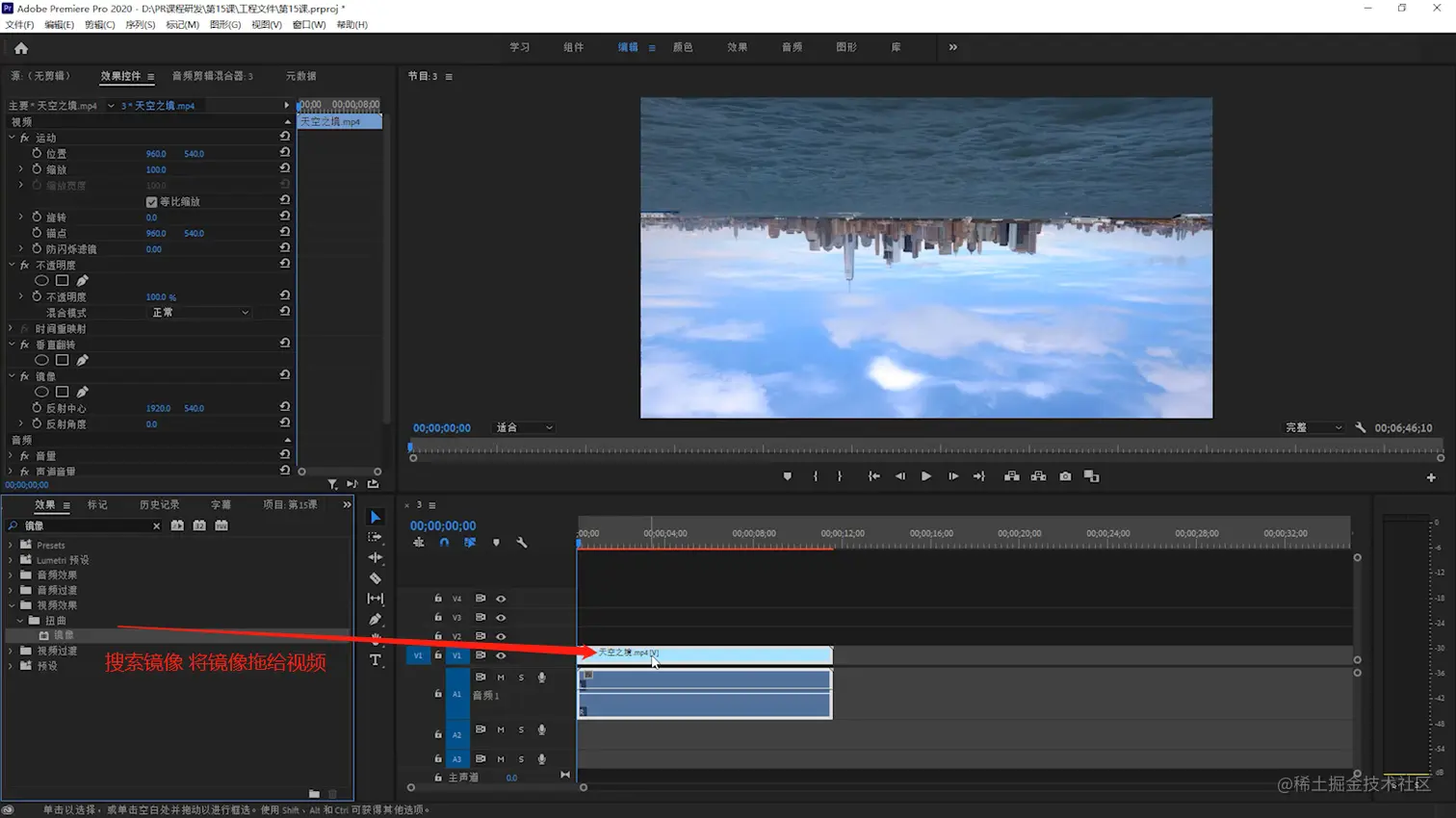 【视频效果】-【扭曲】找到-【镜像】,也可以在搜索栏直接搜索【镜像】,拖给视频