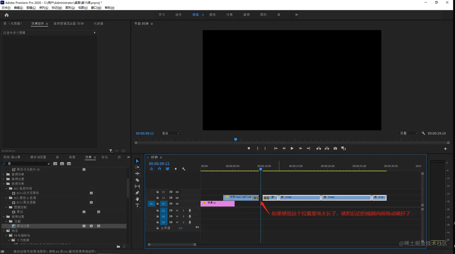 如果感觉黑场的时间太长,可以将两个素材的间隙调整的小一点