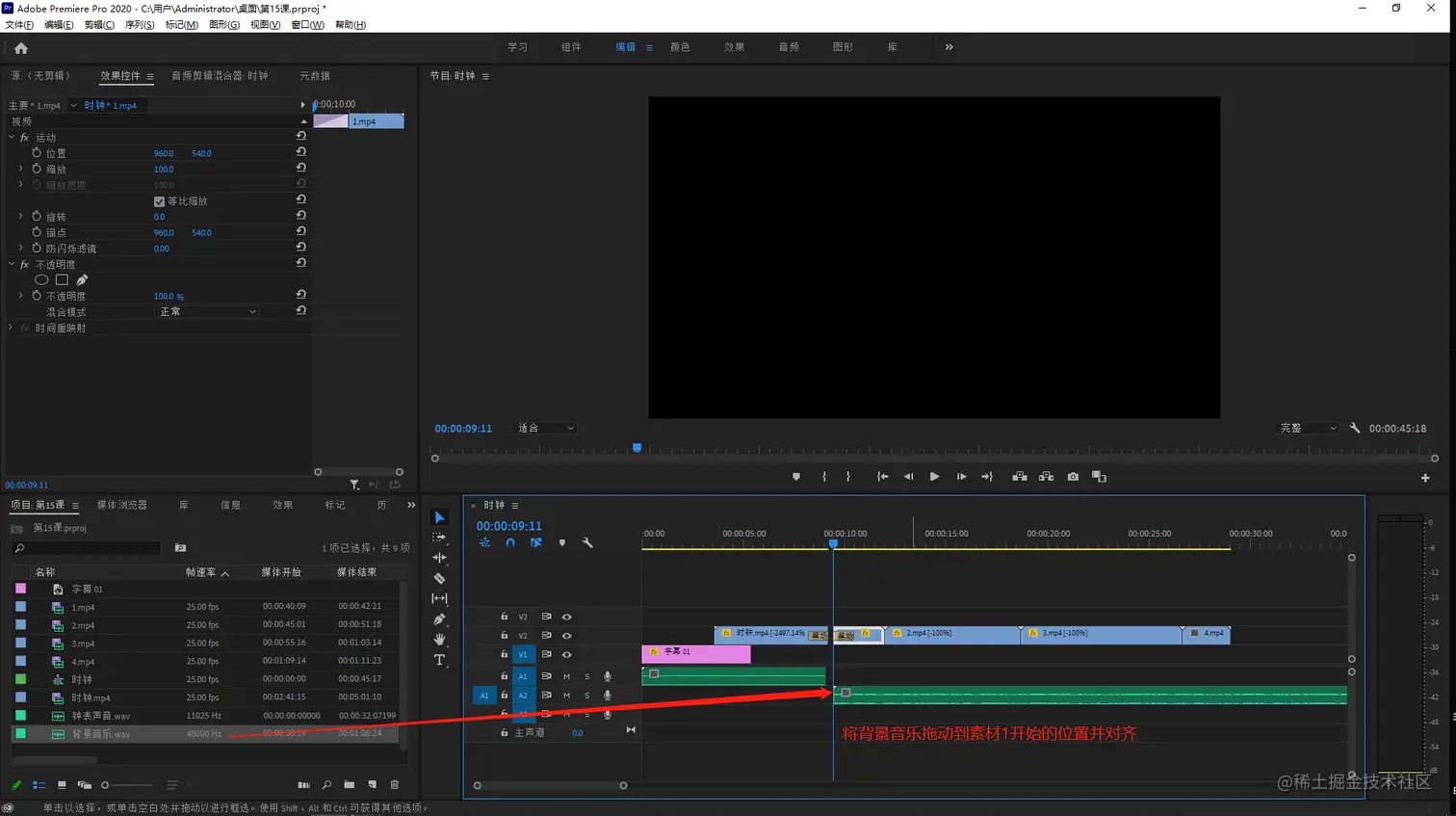 - 将背景音乐拖动到时间线面板上,开始的位置对准素材1开始的位置,