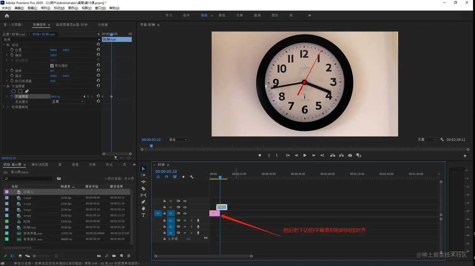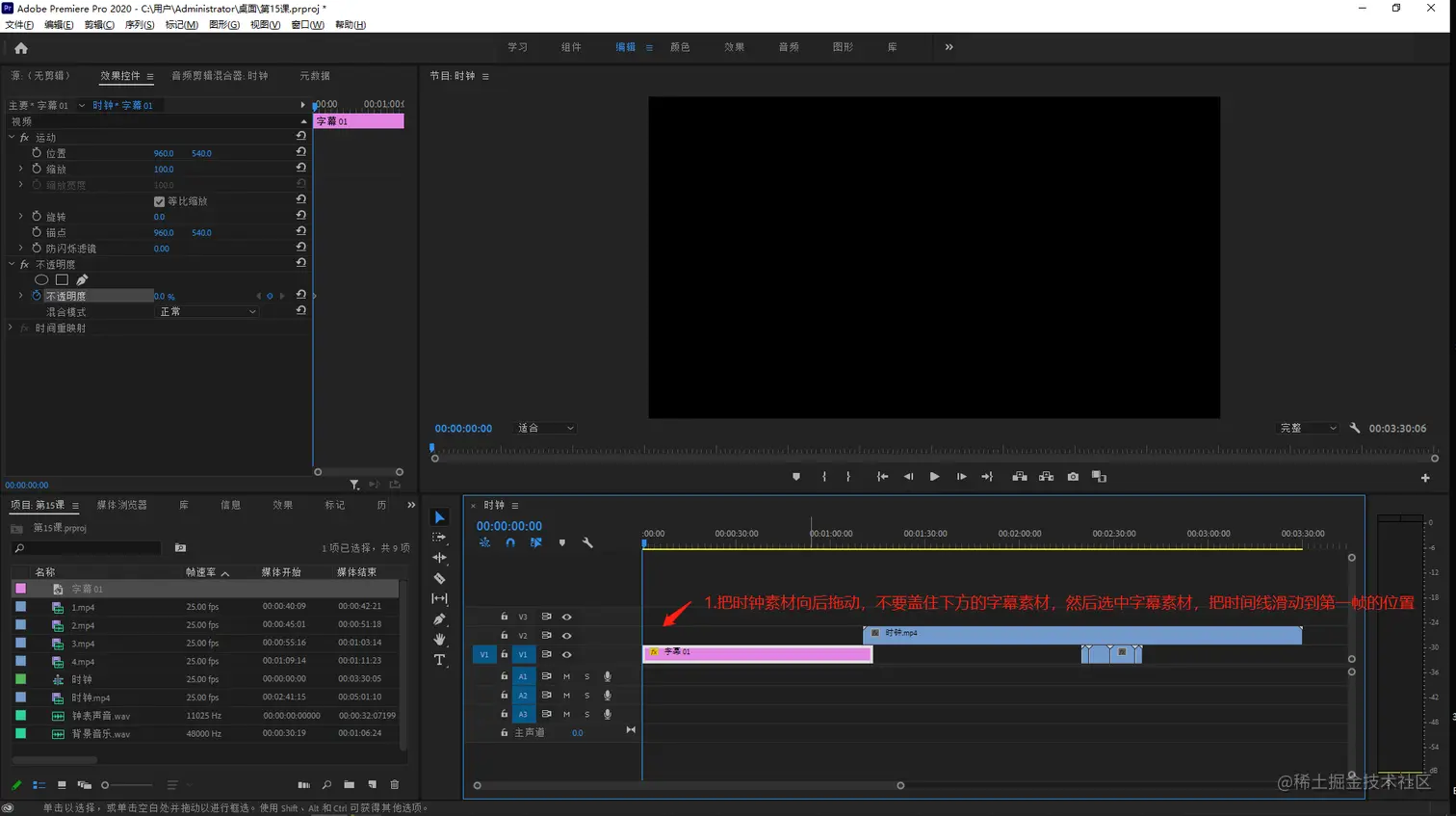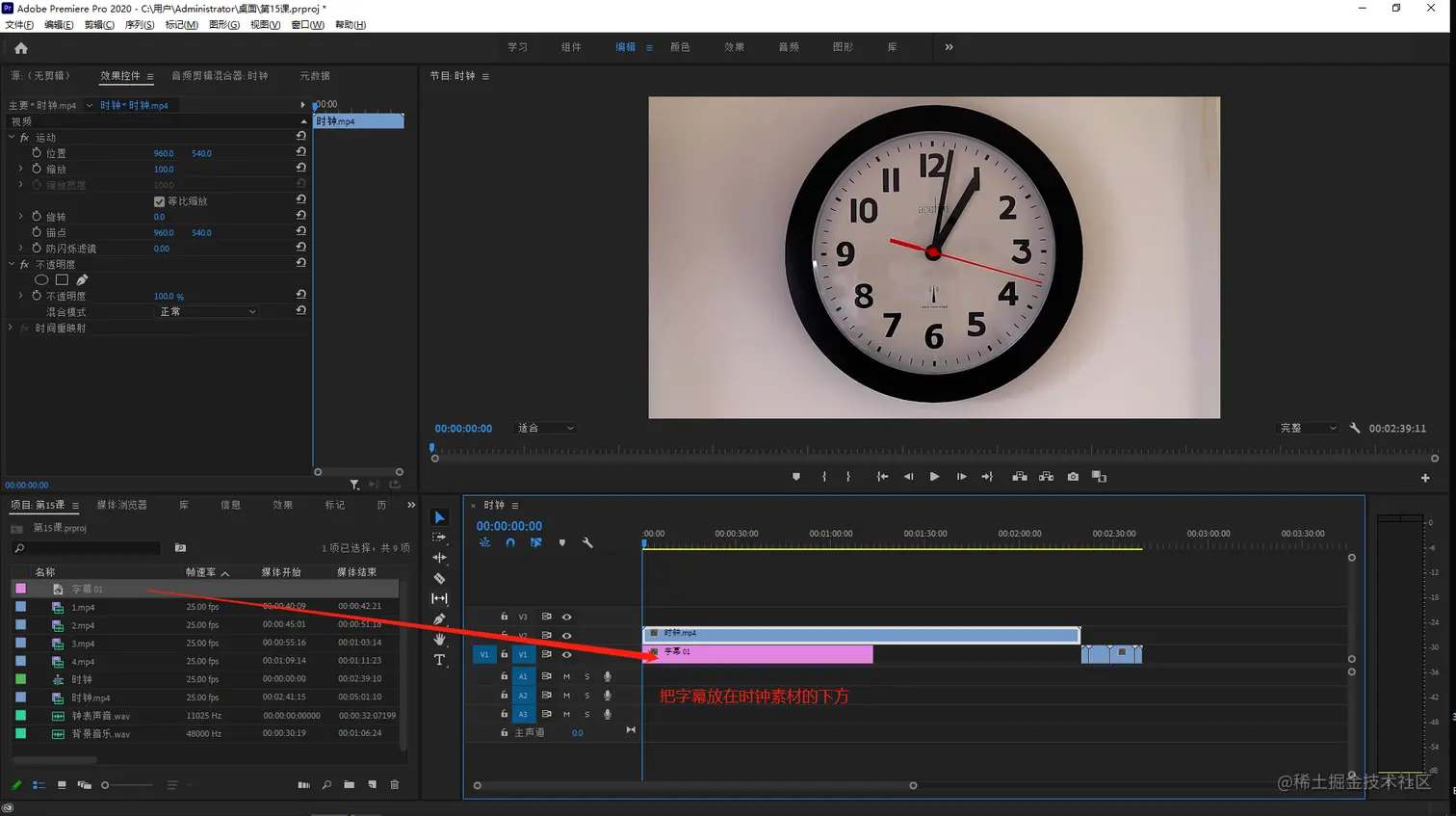 - 把时间线上第一个时钟素材向上移动一个轨道,因为我们要把字幕素材放在下方