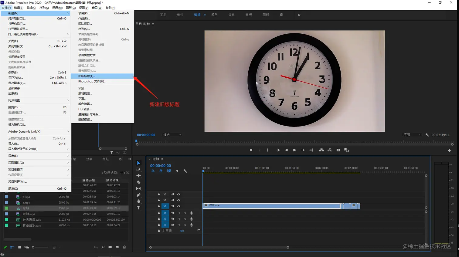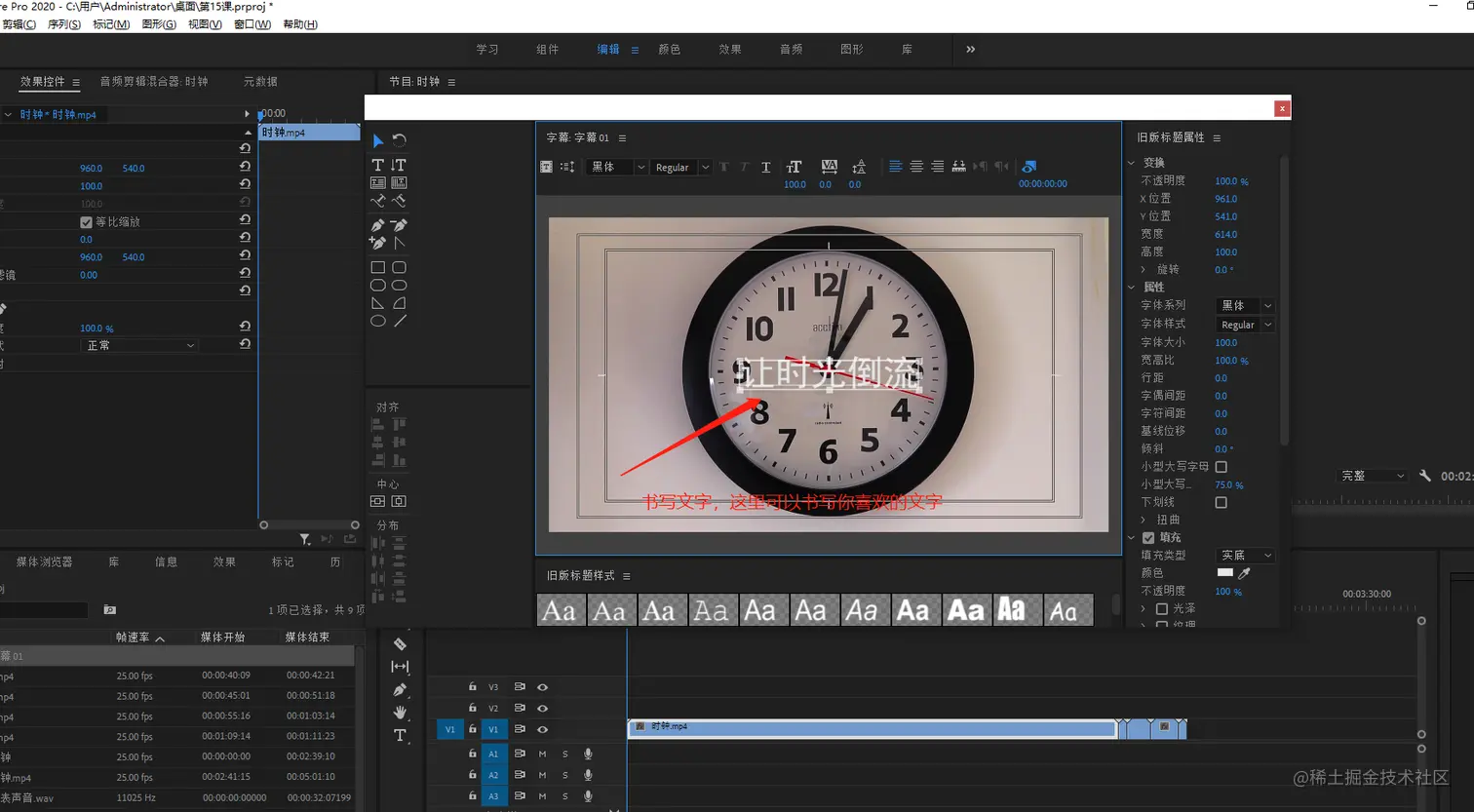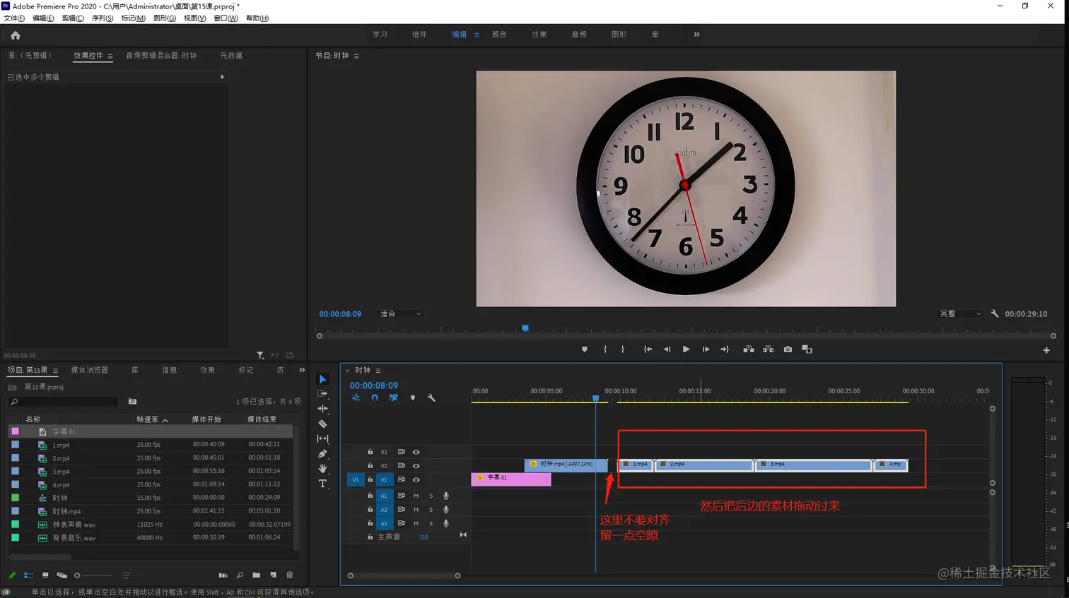 - 把时间线上第一个时钟素材向上移动一个轨道,因为我们要把字幕素材放在下方