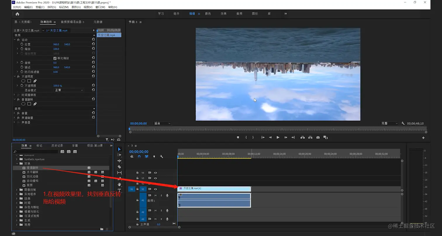 【视频效果】-【变换】找到【Vertical Flip】(中文名:垂直翻转),也可以在搜索栏直接搜索【Vertical Flip】(中文名:垂直翻转)拖给视频