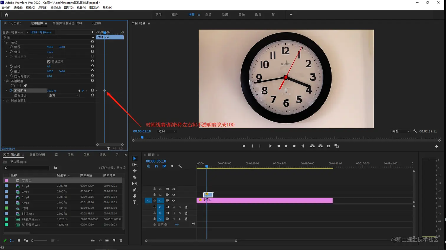 然后时间线滑动5秒左右的位置将时钟素材不透明度的数值改成100