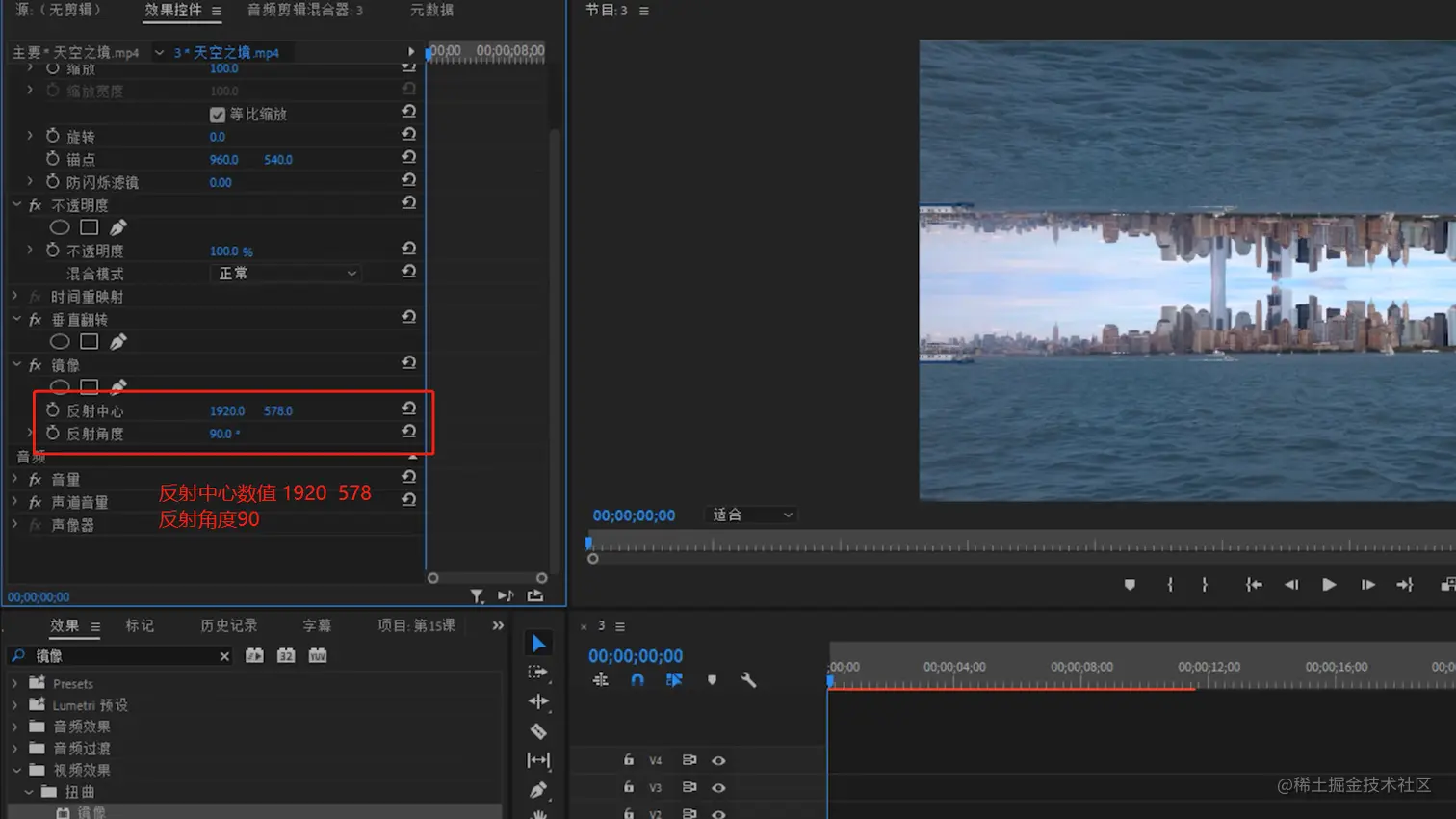 3.将镜像的发射中心设置为 1920 578 反射角度设置为90