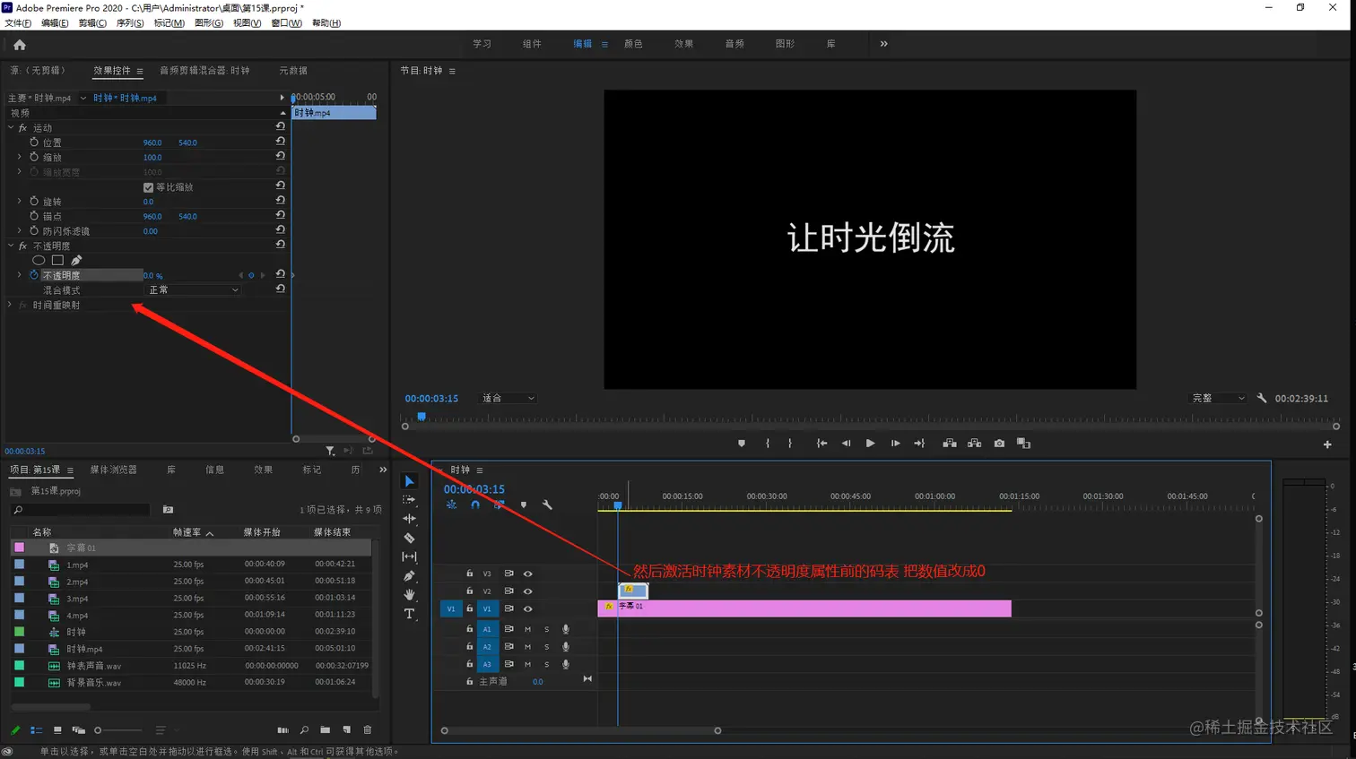 - 选中时钟素材在该素材第一帧的位置,激活不透明度前的码表,将数值改成0