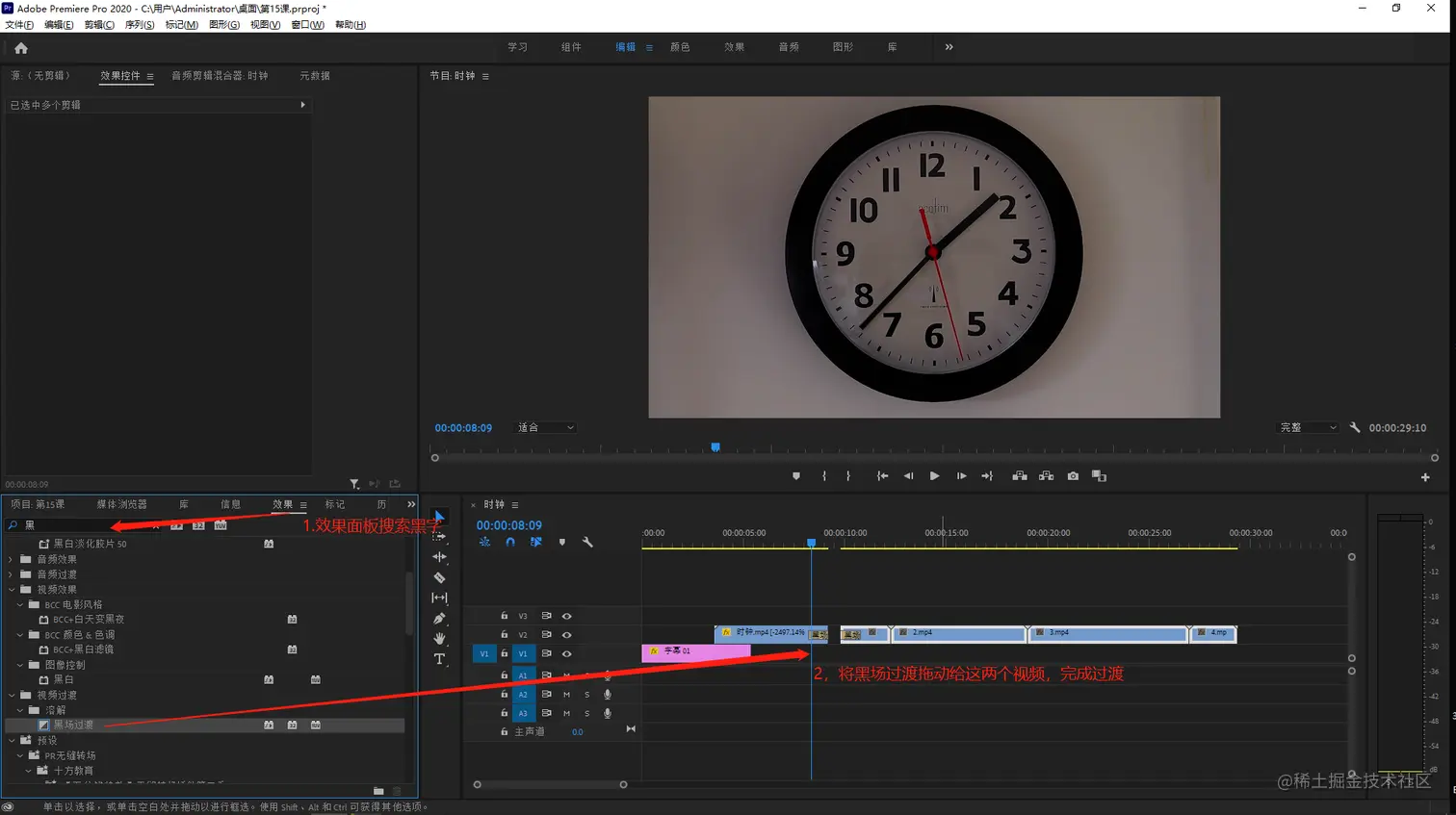 - 在效果面板搜索‘’黑‘’字在下方查找黑场过渡,将黑场过渡分别拖动给,时钟素材结束的位置和素材1开始的位置。给两个素材添加转场