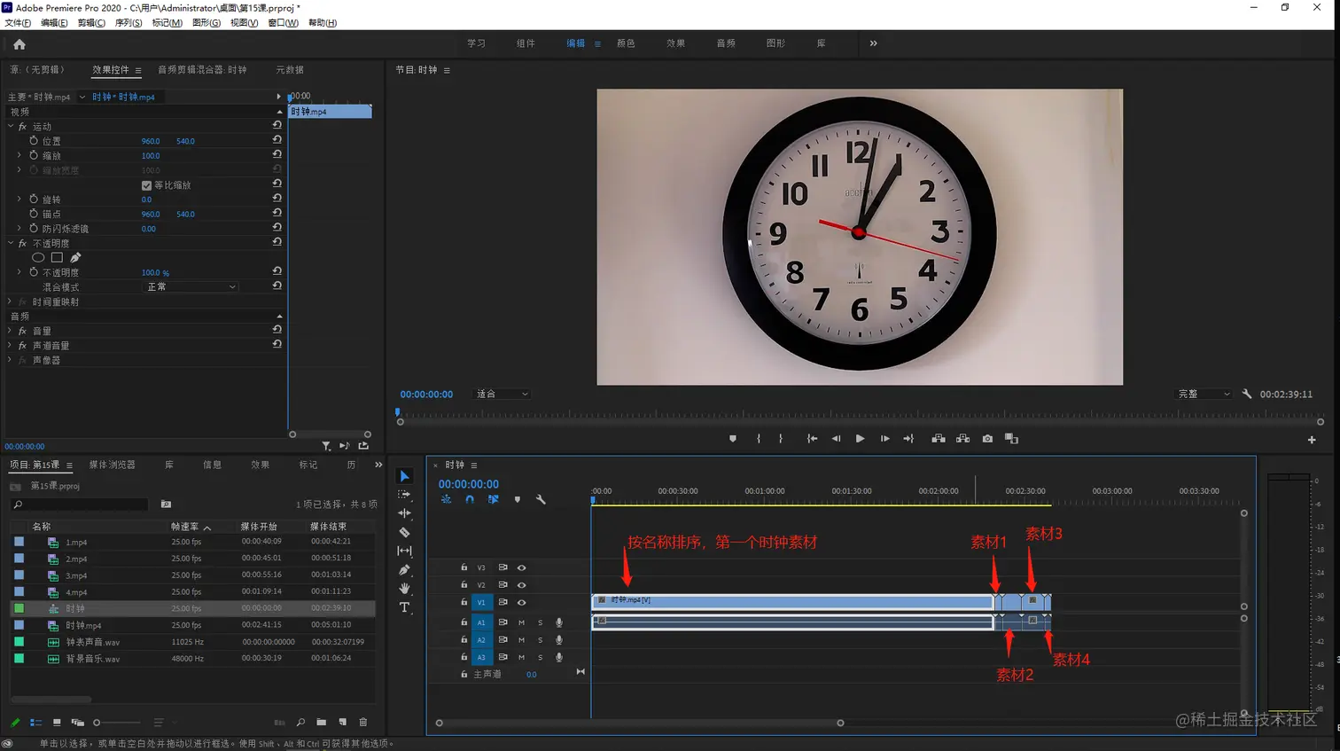 - 将时钟素材开始的位置对齐到时间线