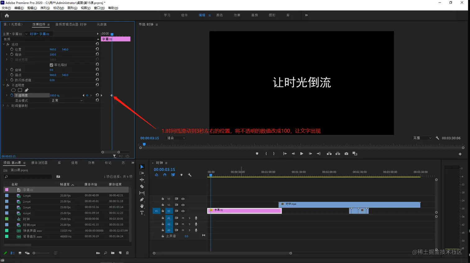 然后把时间线向右侧移动到3秒左右的位置,将不透明度的数值改成100,让文字出现。