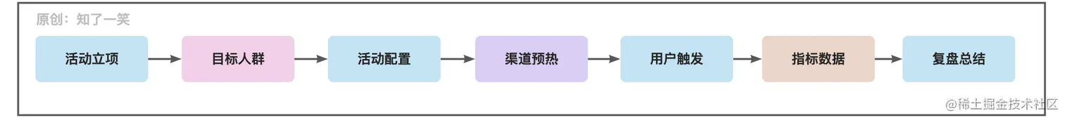 从活动整个流程上来看,分为立项准备,目标人群确定,活动配置,渠道推广预热,用户触发,指标数据分析,复盘总结等几个核心环节,下面站在开发的角度看一看核心节点的设计与逻辑;