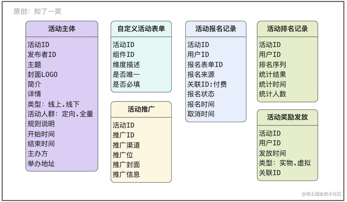 先从活动管理的角度看看表结构的设计,主要围绕活动的基础信息,自定义表单配置项,活动推广,活动的报名和排名计算,以及奖励发放记录等;