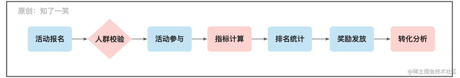 当用户在报名参与活动时,会校验是否符合目标人群的设定,符合即可参与活动,之后便根据活动的规则配置,进行指标计算和排名统计,活动结束后进行奖励发放和转化过程分析;