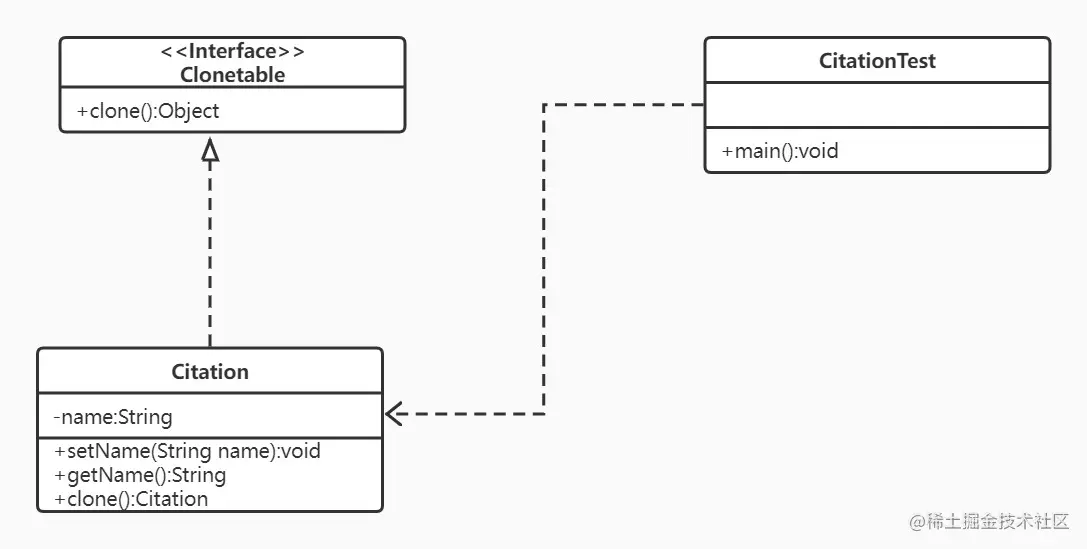 在JDK中的Object类中提供了clone()方法来实现浅克隆。Cloneable接口是上面类图中的抽象原型,而实现了Cloneable接口的子实现类就是具体的原型类。