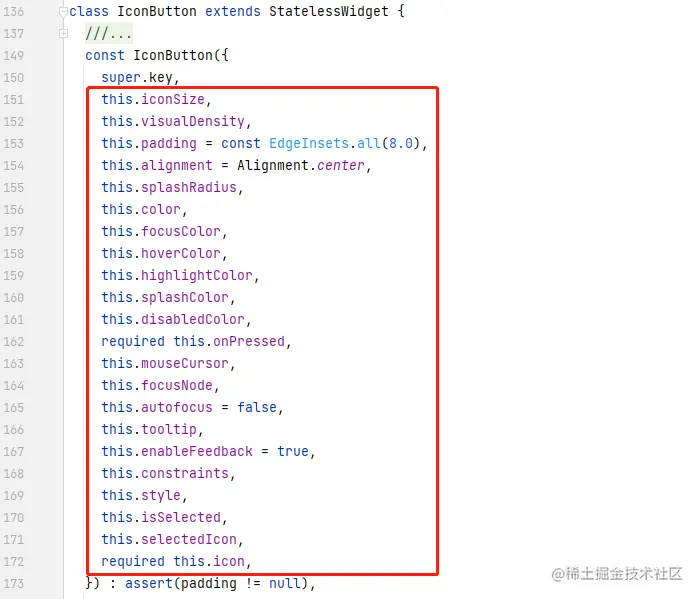下面来简单看一下 IconButton 组件的源码实现,首先,它继承自 StatelessWidget ,表明它是基于已有组件封装构建逻辑,从而形成的新组件。 从构造方法中可以到有大量的可配置属性: