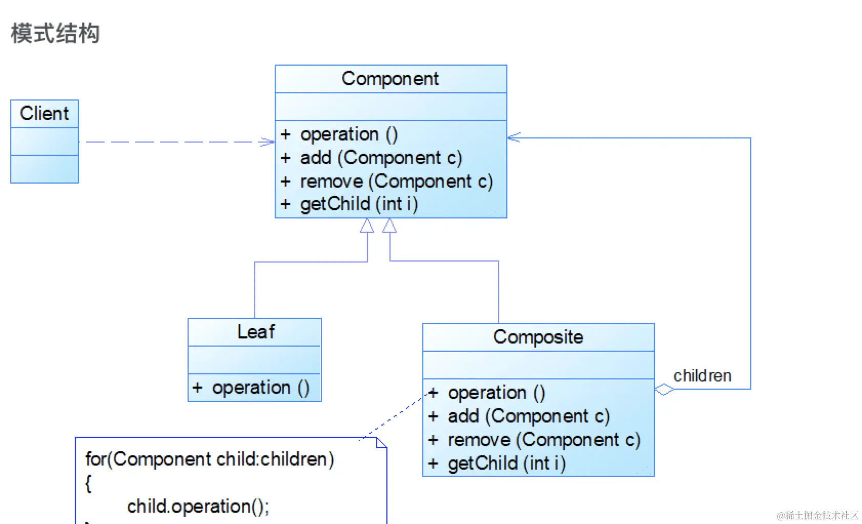 组合模式(Composite Pattern):组合多个对象形成树形结构以表示“整体-部分”的结构层次。组合模式对单个对象(即叶子对象)和组合对象(即容器对象)的使用具有一致性