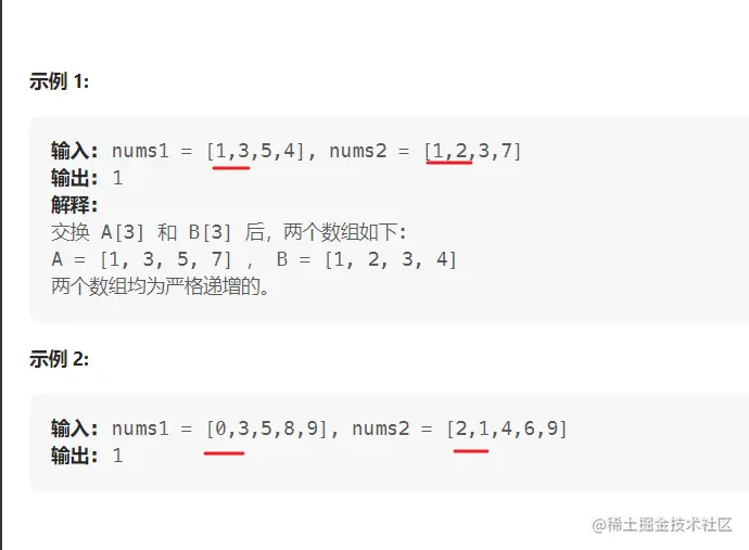 根据题目要求,我们知道题目给出的 num1 和 nums2 长度一致,需要我们通过交换其对应位置上的值,来达到 nums1 和 nums2 严格单调递增,题目要求我们找到最少的交换次数,就可以达到这个目的