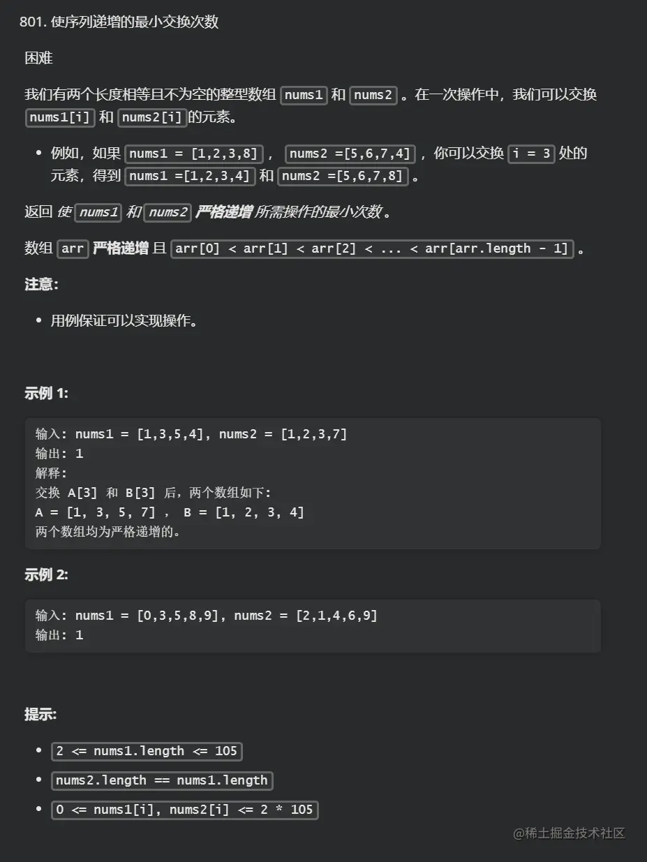这是 力扣上的 801. 使序列递增的最小交换次数,难度为 困难。