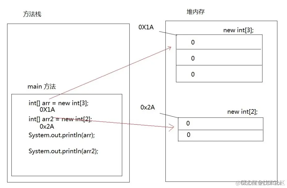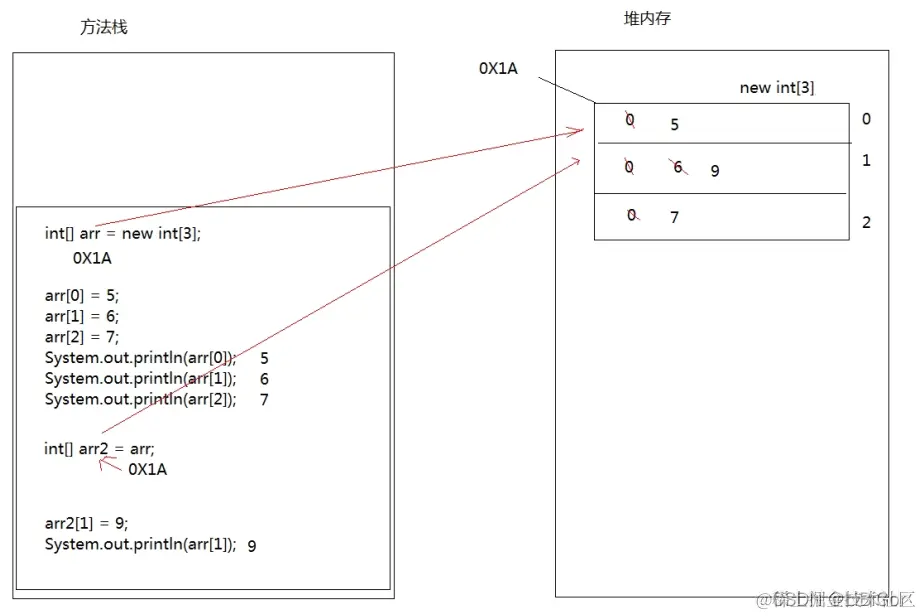 1.数组也是一种引用类型: 数组名称保存的也是数组在堆内存空间的地址值