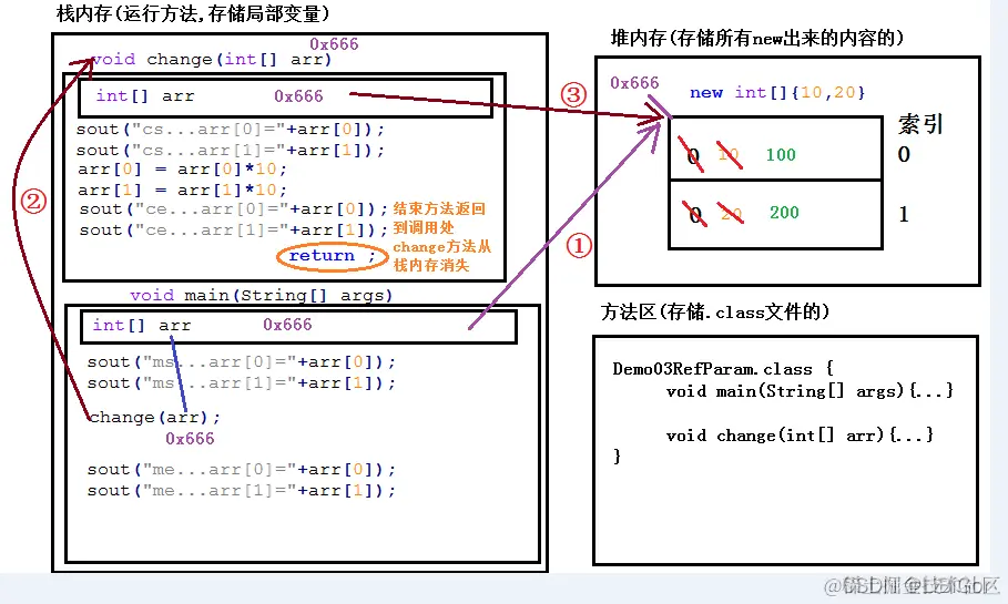 2.数组作为方法参数或者返回值: 传递的都是数组在堆内存空间的地址值