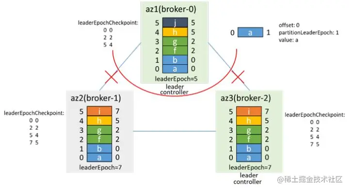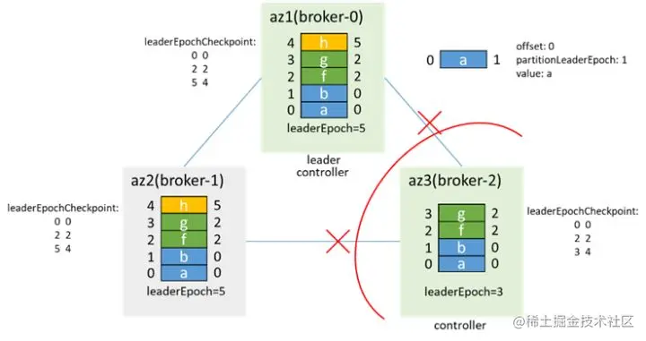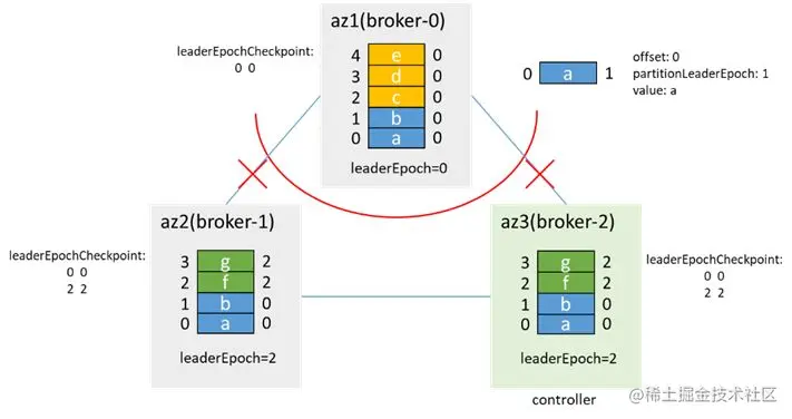 示例:(假设网络隔离前有两条消息,leaderEpoch=0)