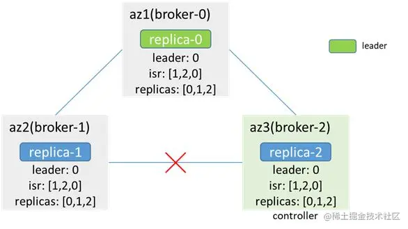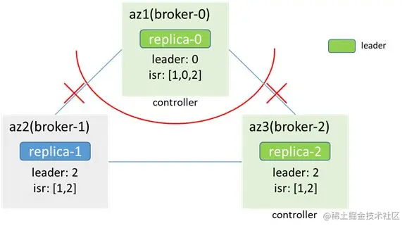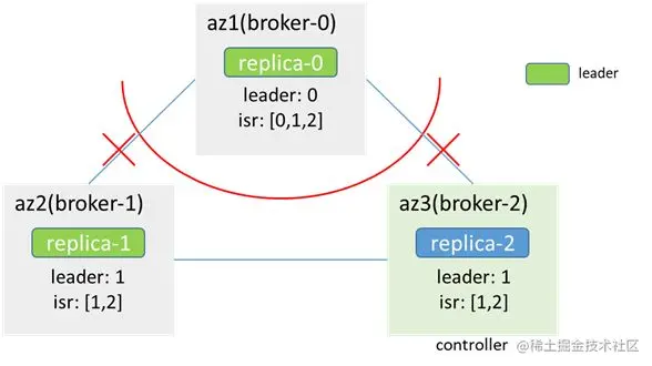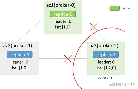 隔离后,az1 网络隔离,zk 不可用,broker-2 竞选为 controller,出现 controller 双主,同时 replica-2 成为 leader,分区也出现双主