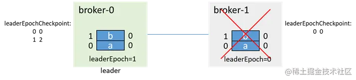还是这个例子,broker-0 为 leader,broker-1 为 follower,各有两条消息 a、b,此时 broker-1 宕机,isr=[0]