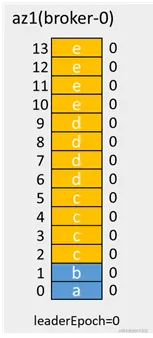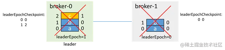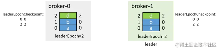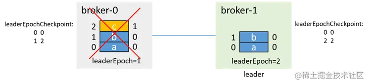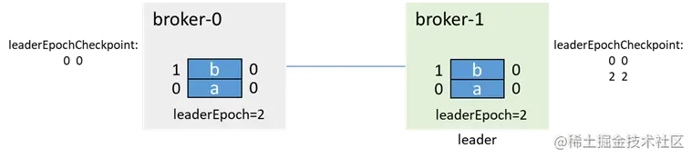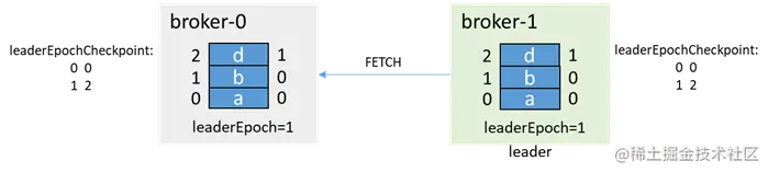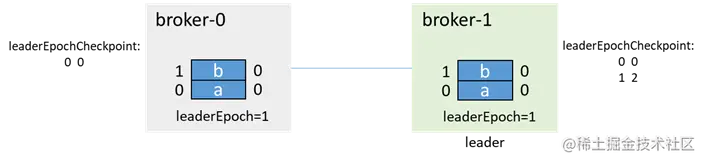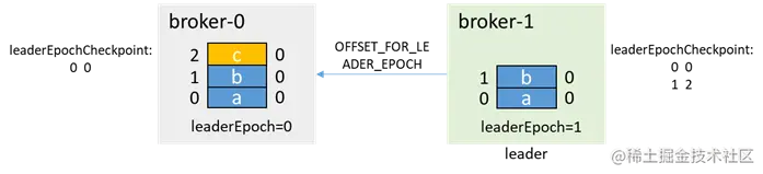 然后 broker-0 启动,此时为 follower,通过 OFFSET_FOR_LEADER_EPOCH 从 broker-1 获取 leaderEpoch=0 的 endOffset
