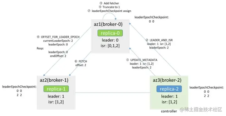 由于 controller 在 broker-2,缓存和 zk 中的 leader 都是 broker-1,controller 会告知 broker-0 makerFollower,broker-0 随即 add fetcher,会先从 leader(broker-1)获取 leaderEpoch 对应的 endOffset(通过 OFFSET_FOR_LEADER_EPOCH),根据返回的结果进行 truncate,然后开始 FETCH 消息,并根据消息中的 leaderEpoch 进行 assign,以此和 leader 保持一致